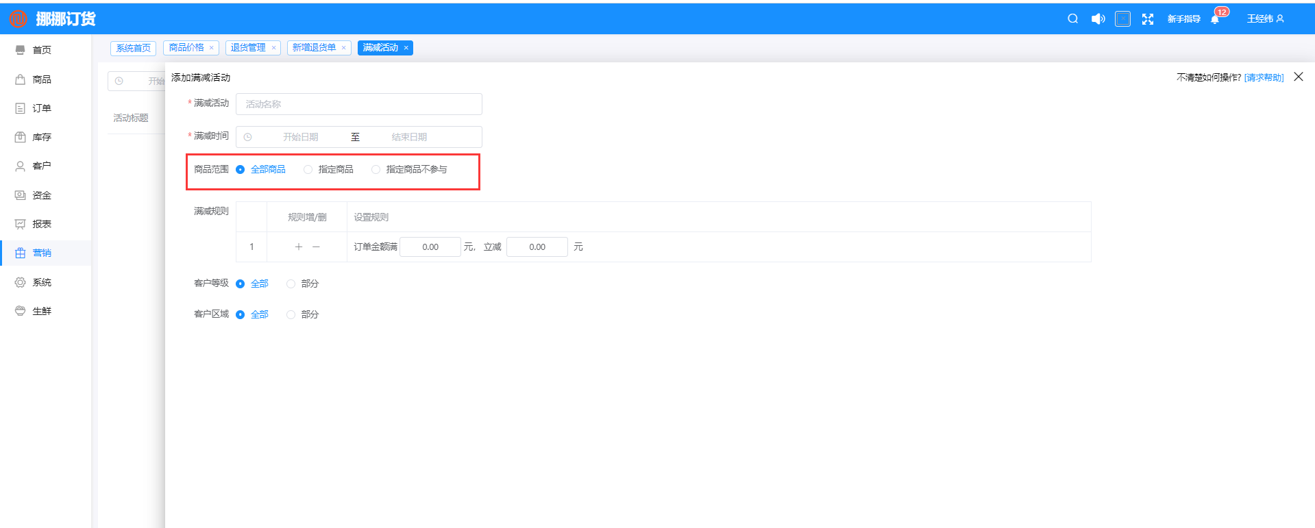 路徑:營銷-營銷活動(dòng)-滿減活動(dòng)-新增活動(dòng)