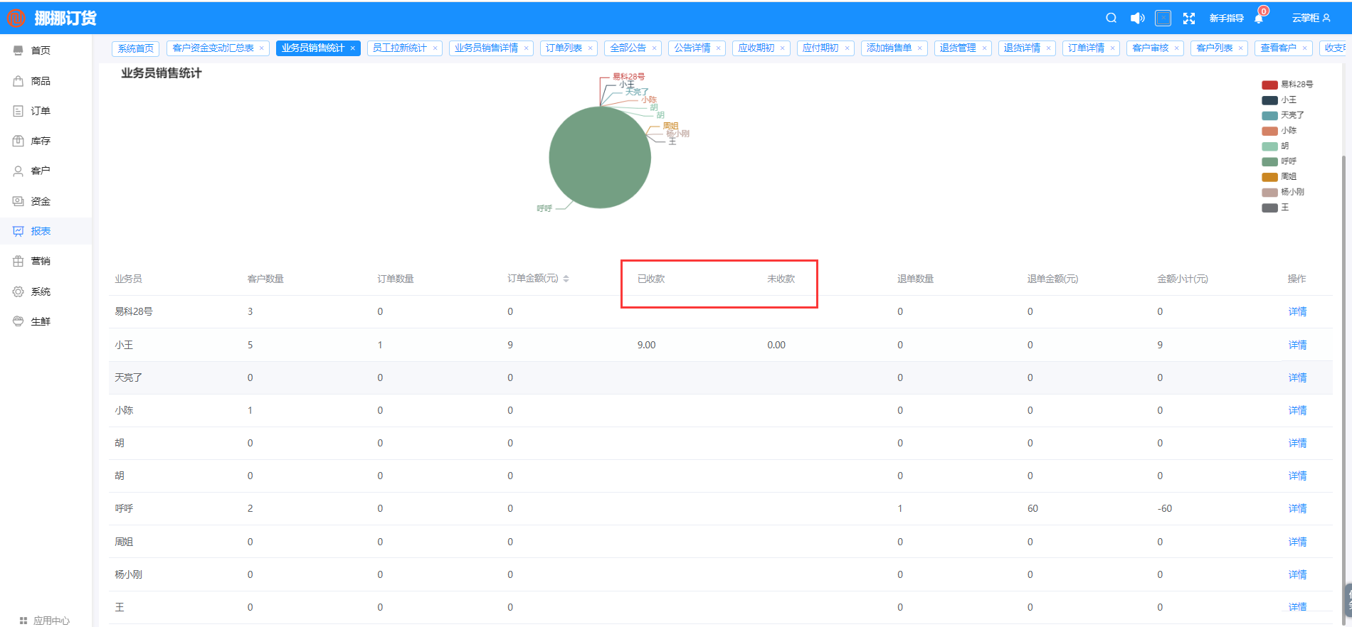 6.業(yè)務(wù)員業(yè)績報(bào)表新增已收款金額和未收款金額