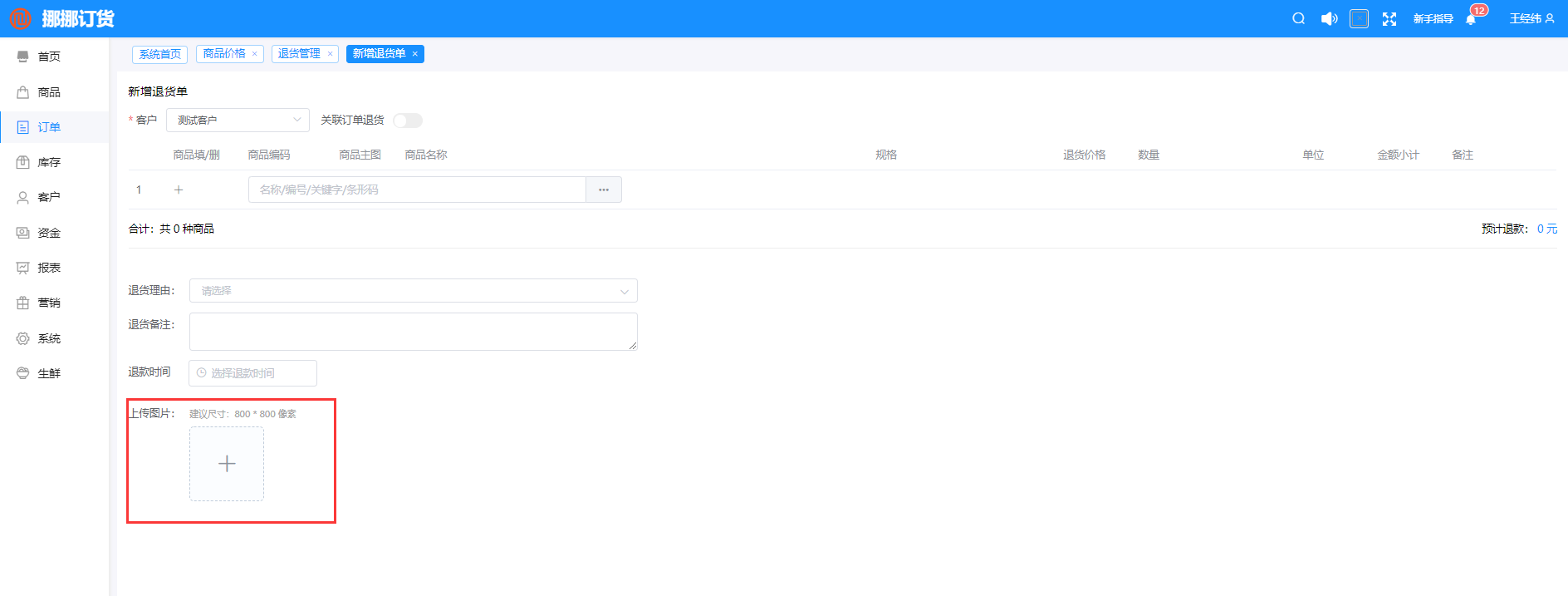 路徑:訂單-訂單管理-退貨管理-新增退貨單